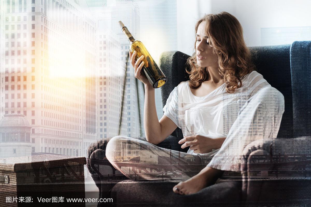 抑郁的女人在家喝酒