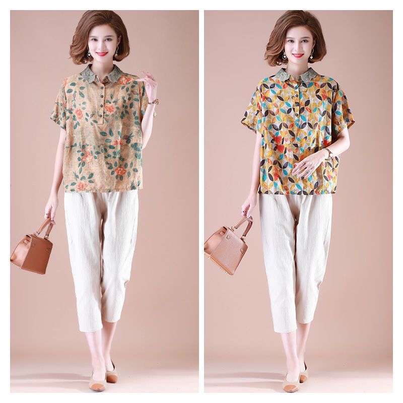 中老年人套装女棉麻2022新款五六十岁中年妈妈夏装短袖两件套洋气