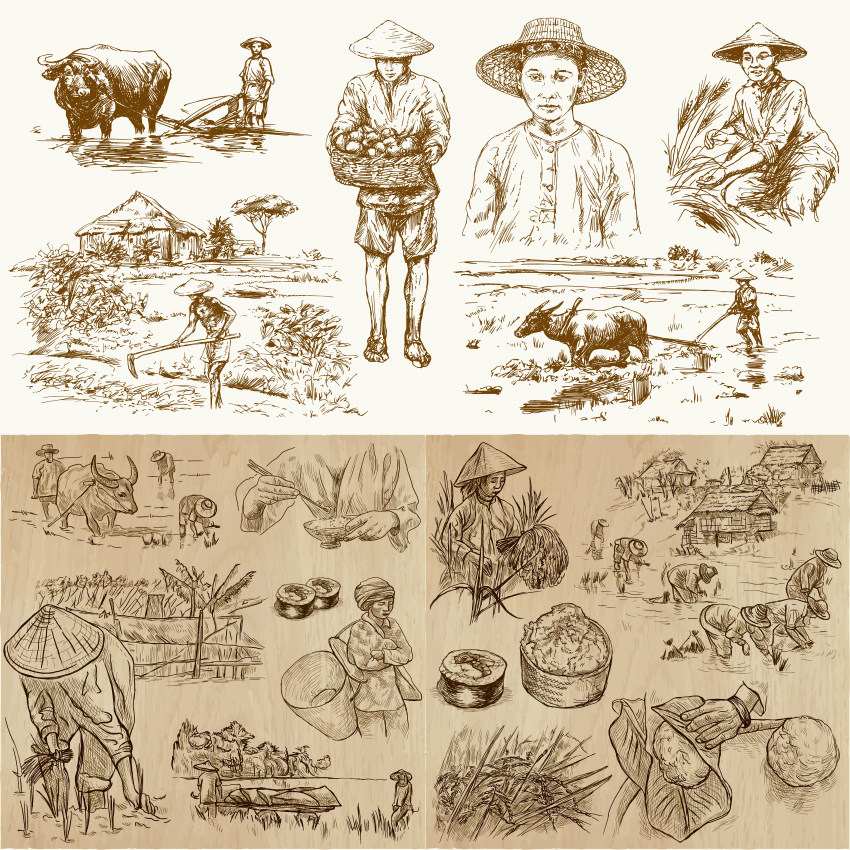 复古手绘素描线描丰收季节农民耕田稻田农场牧场乡村eps矢量素材