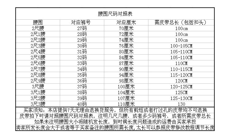 皮带尺码对照表