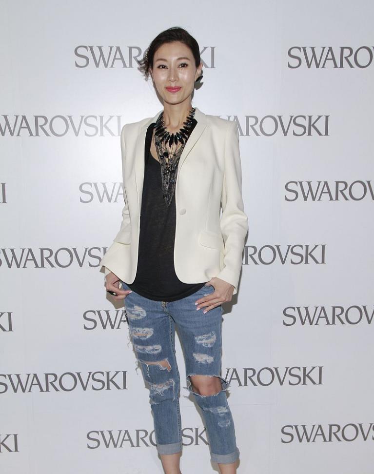 48岁李嘉欣白色西装破洞牛仔裤脚下一双绿色高跟鞋抢镜了