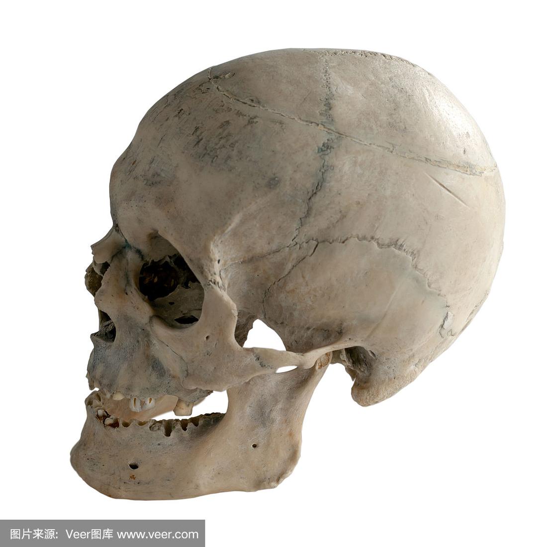 人类头骨的侧面.孤立在白色的.