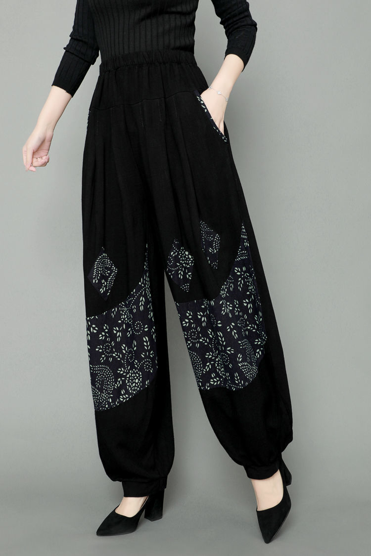【70棉30亚麻】亚麻坠感灯笼裤女碎花民族风高腰休闲裤宽松大码复古
