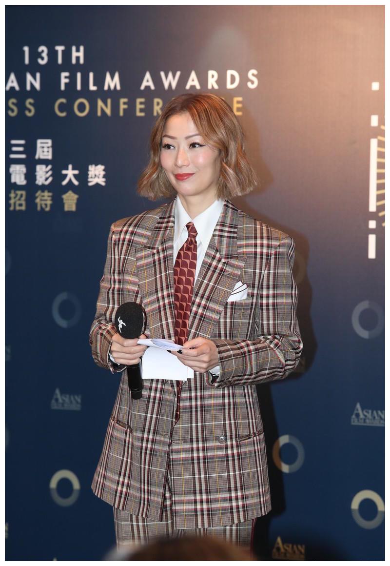 郑秀文真会打扮,格纹西装知性干练,亚麻色头发显白又洋气