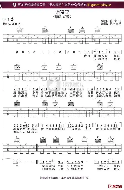 胡歌《逍遥叹》吉他谱c调吉他弹唱谱