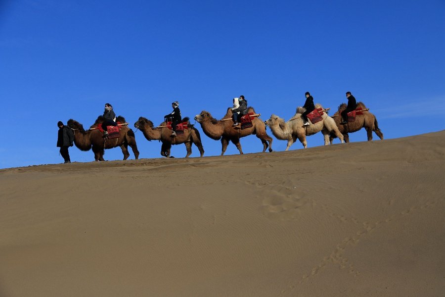 游客在鸣沙山月牙泉景区乘骑骆驼游览 张晓亮 摄