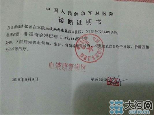 医院出具的证明耿耿化疗需要三十多万元.