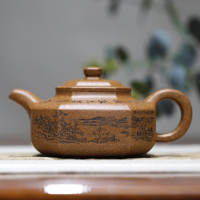 紫砂壶.刻绘名家陈宏林藏六方 190cc 原矿黄金段,陈宏林 - 抖音