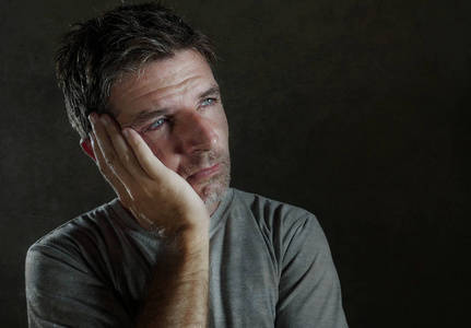 的黑暗背景肖像,30到40岁的悲伤和沮丧的人,看上去体贴和担心的痛苦