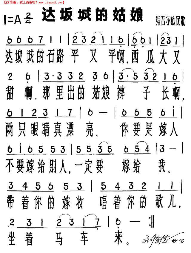 【蔓萝音乐】 简谱-《达坂城的姑娘》新疆民歌