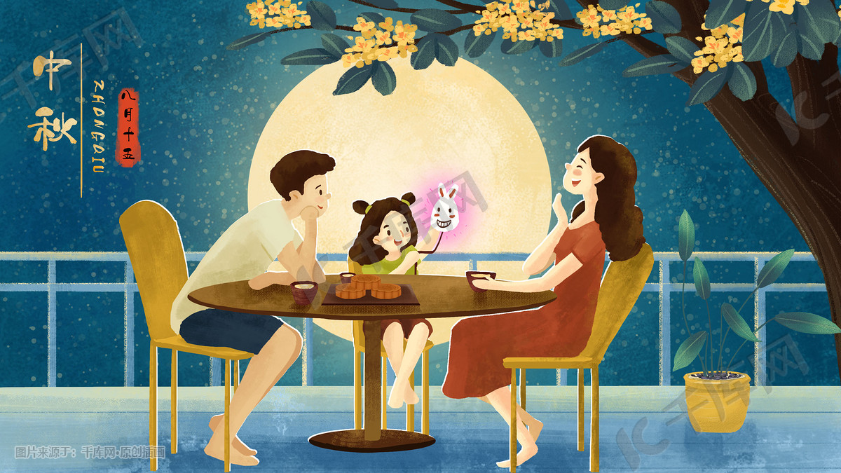 中秋节家庭一家三口吃月饼赏月中秋背景