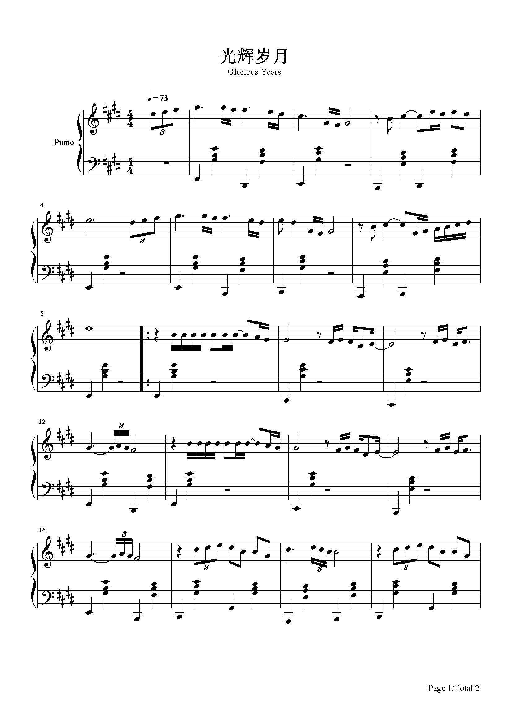 光辉岁月-beyond-e调 -流行钢琴五线谱