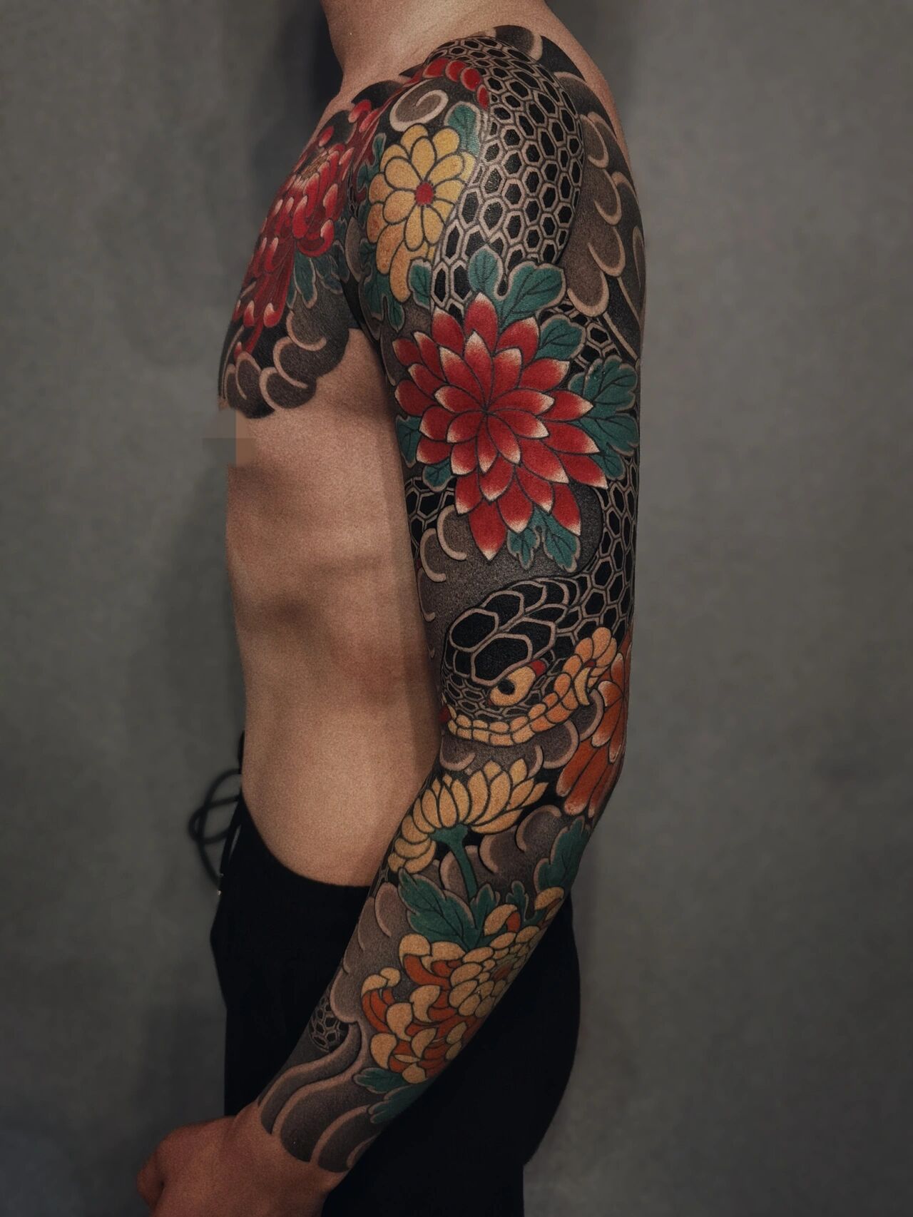 老传统日式花臂半甲.#深圳纹身 #老传统 #作品分享 - 抖音