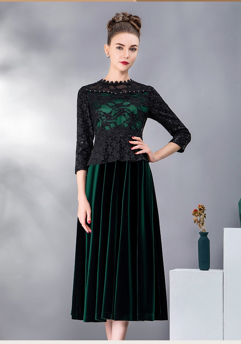名兰世家丝绒连衣裙2021春季新款婆婆蕾丝礼服连衣裙