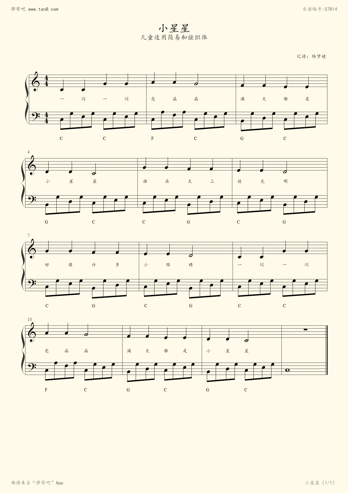 《小星星,钢琴谱》民歌(五线谱 钢琴曲 指法)-弹吧|蛐蛐钢琴网