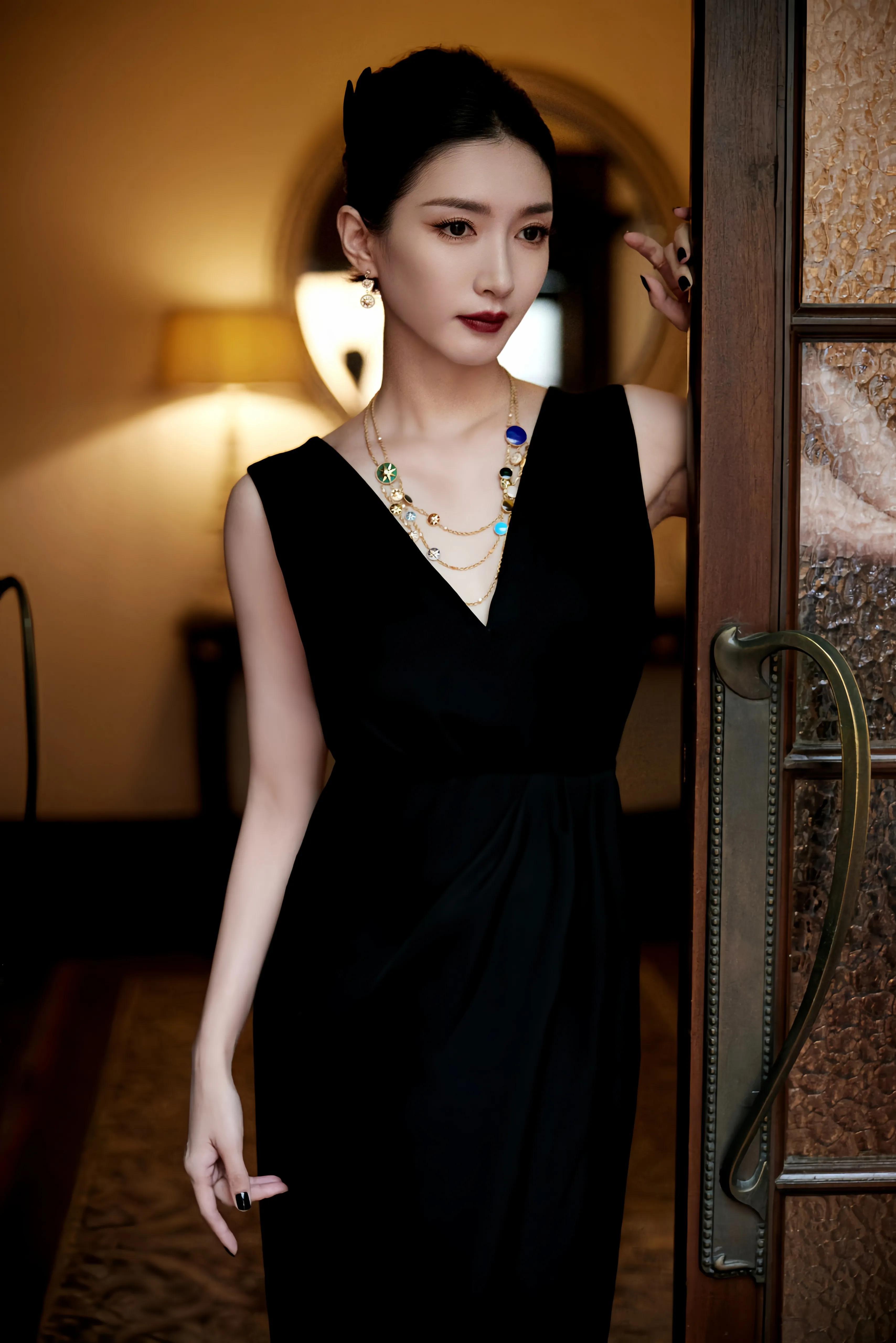 江疏影黑色v领连衣裙封面展现独特个性风格_女士_项链_造型