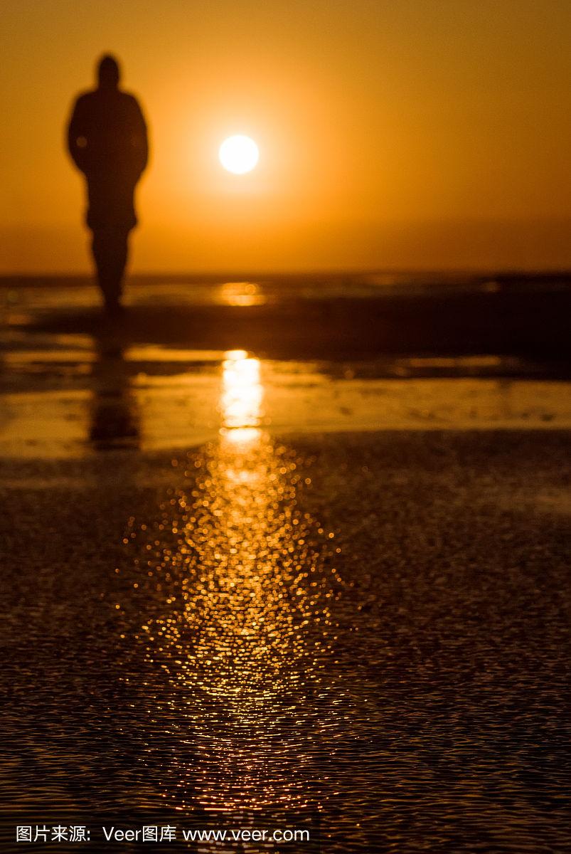 夕阳的倒影和一个孤独男子模糊的剪影在背景