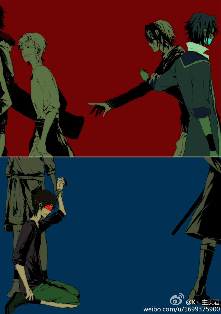 求动漫图片,一个人向一侧走,另一群人反方向走,类似我画的这种感觉!