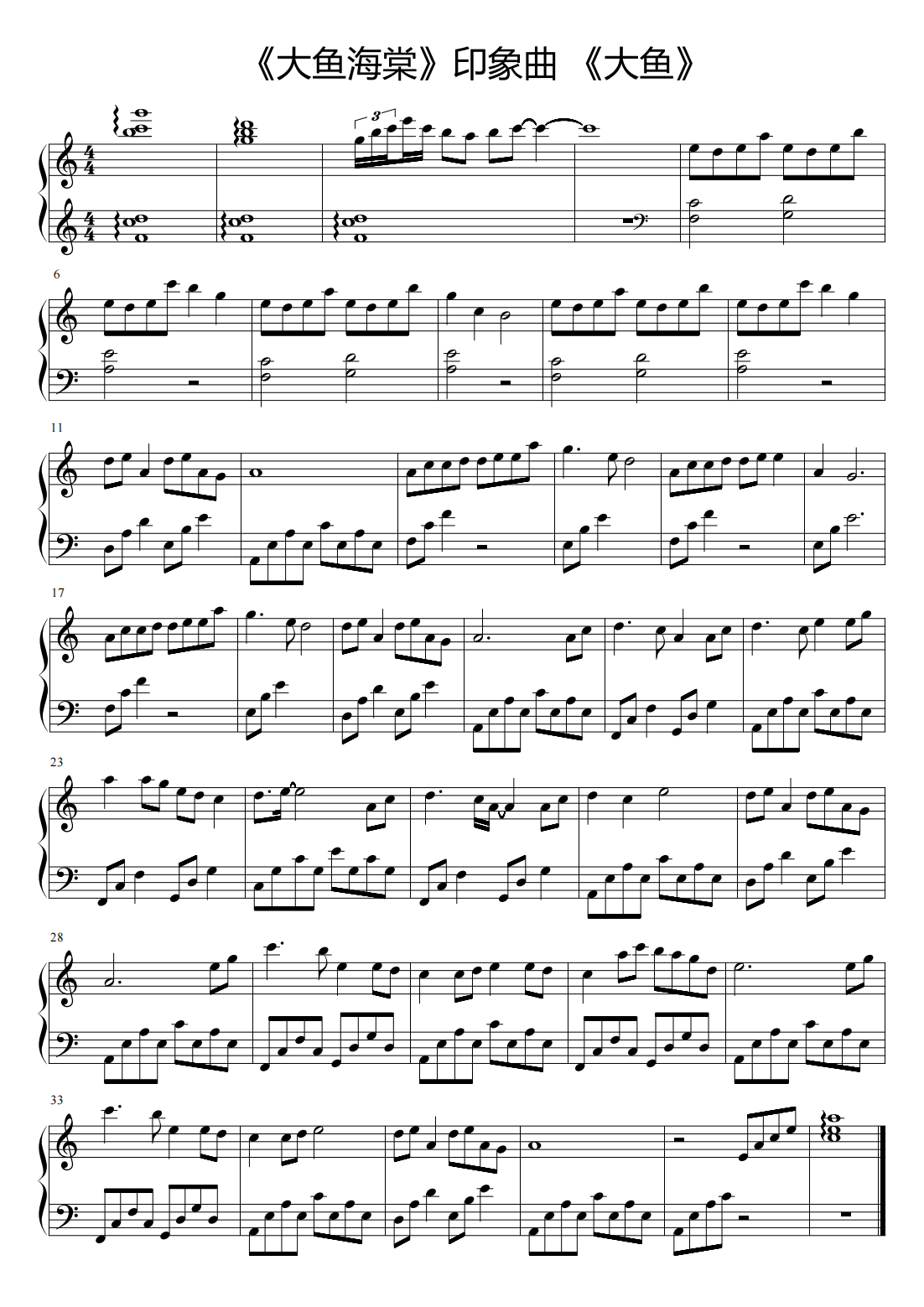 今日分享~《大鱼》钢琴谱,c调低难度#大鱼钢琴曲 #五线谱 - 抖音