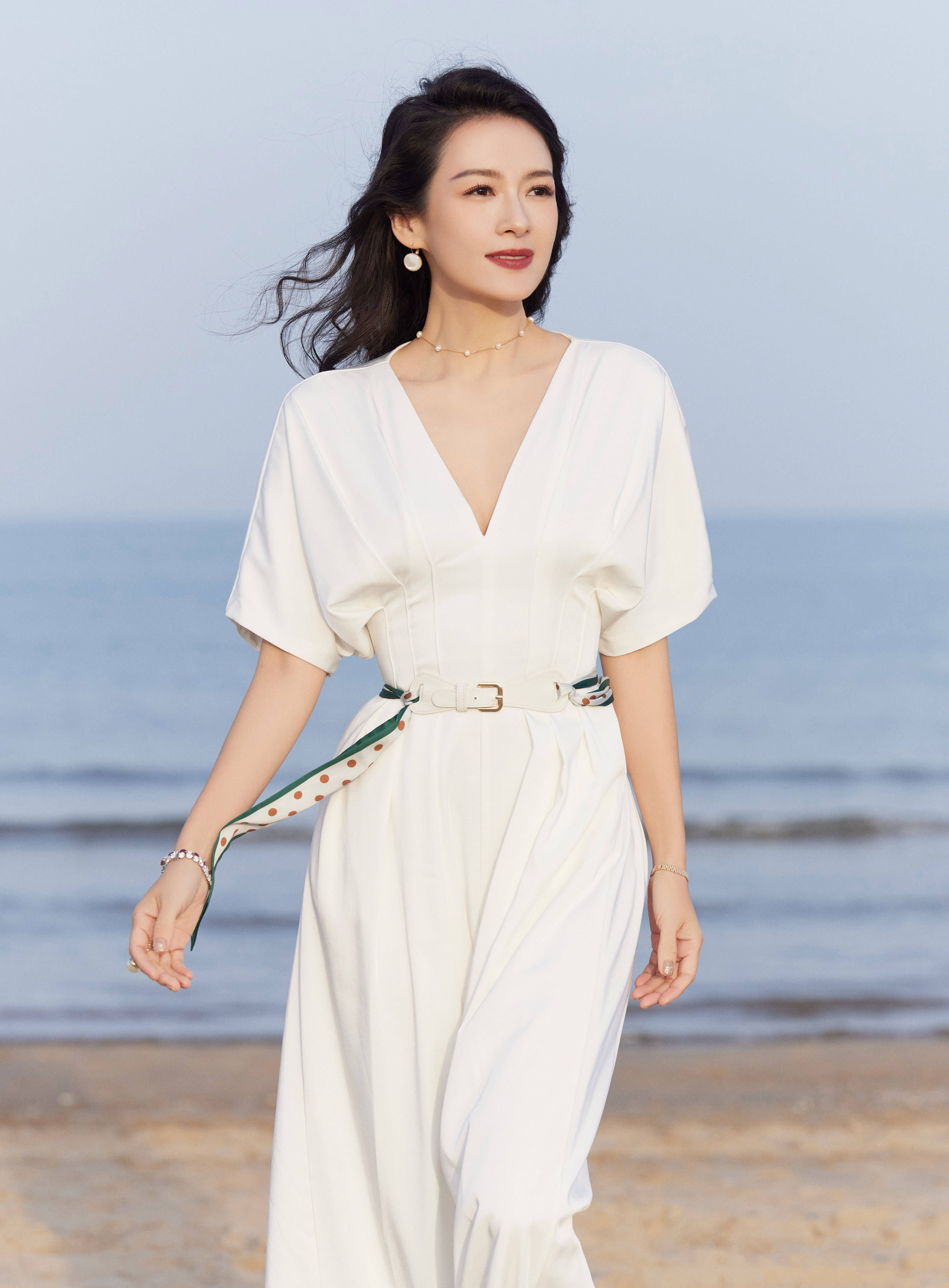 章子怡身穿白色深v套装显精致,笑容灿烂,气质优雅出众.