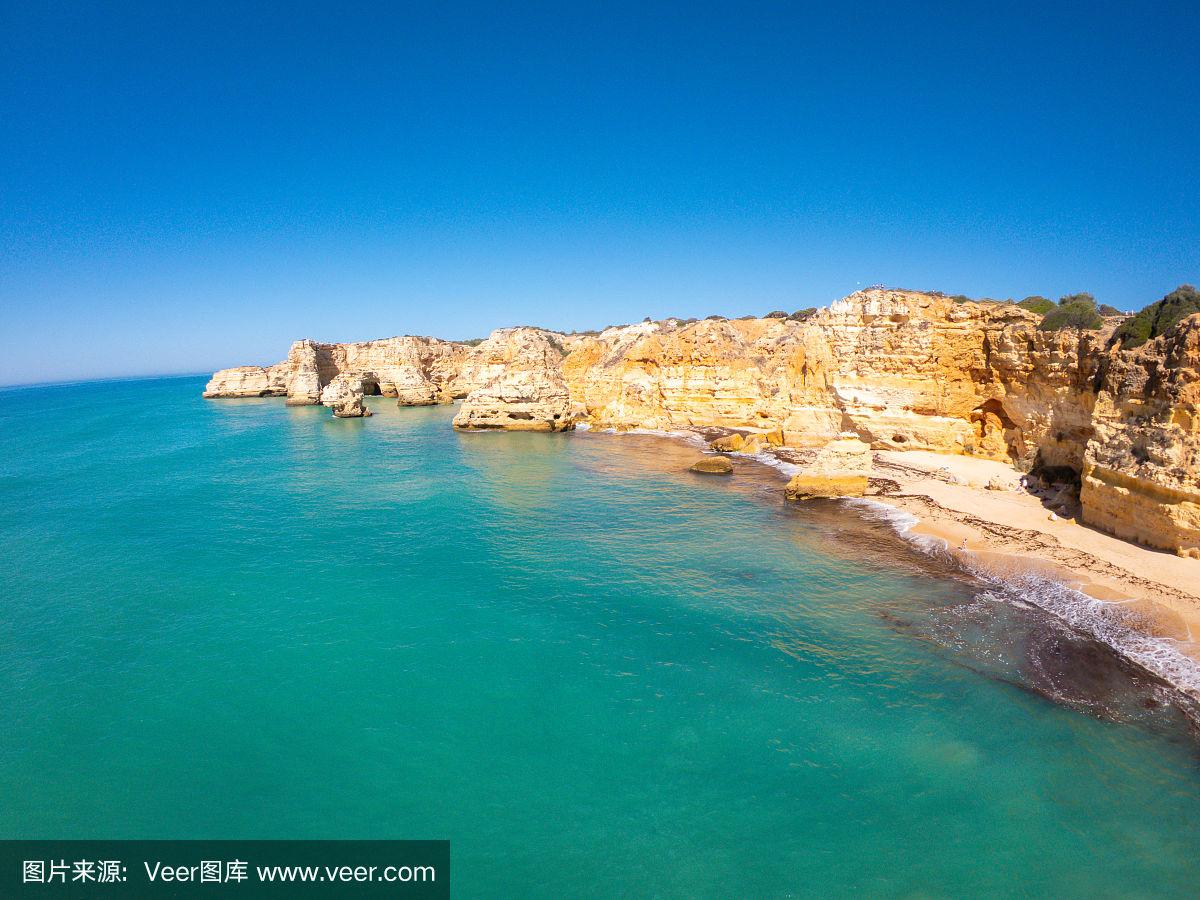 鸟瞰葡萄牙阿尔加维滨海平原.大西洋沿岸的岩层和悬崖