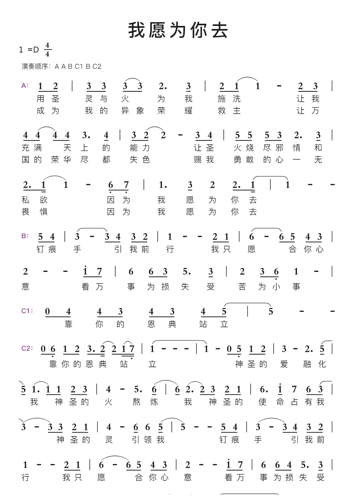 主我愿单属你 - 简谱 | 基督教歌谱网