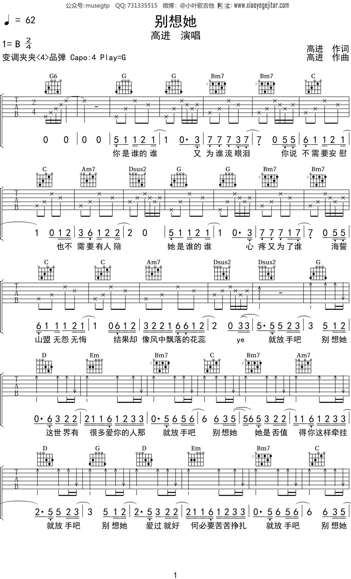 高进《别想她》吉他谱g调吉他弹唱谱