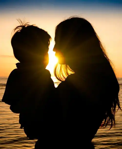 母亲和儿子在一个深的时刻爱日落期间在海滩母亲节