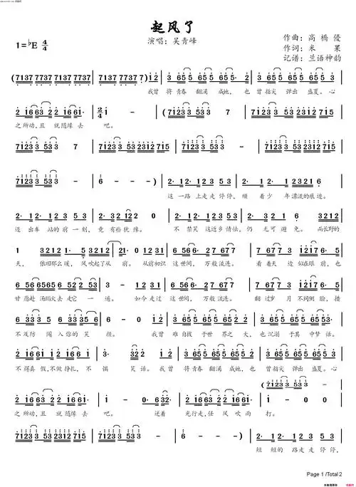 古筝谱【起风了】吴青峰