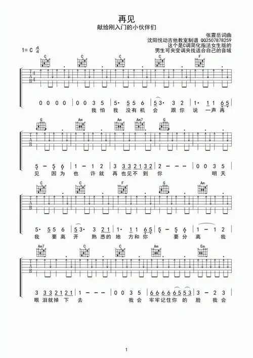 张震岳 再见 g调指法 吉他谱 无限延音编配g调六线pdf谱吉他谱-虫虫