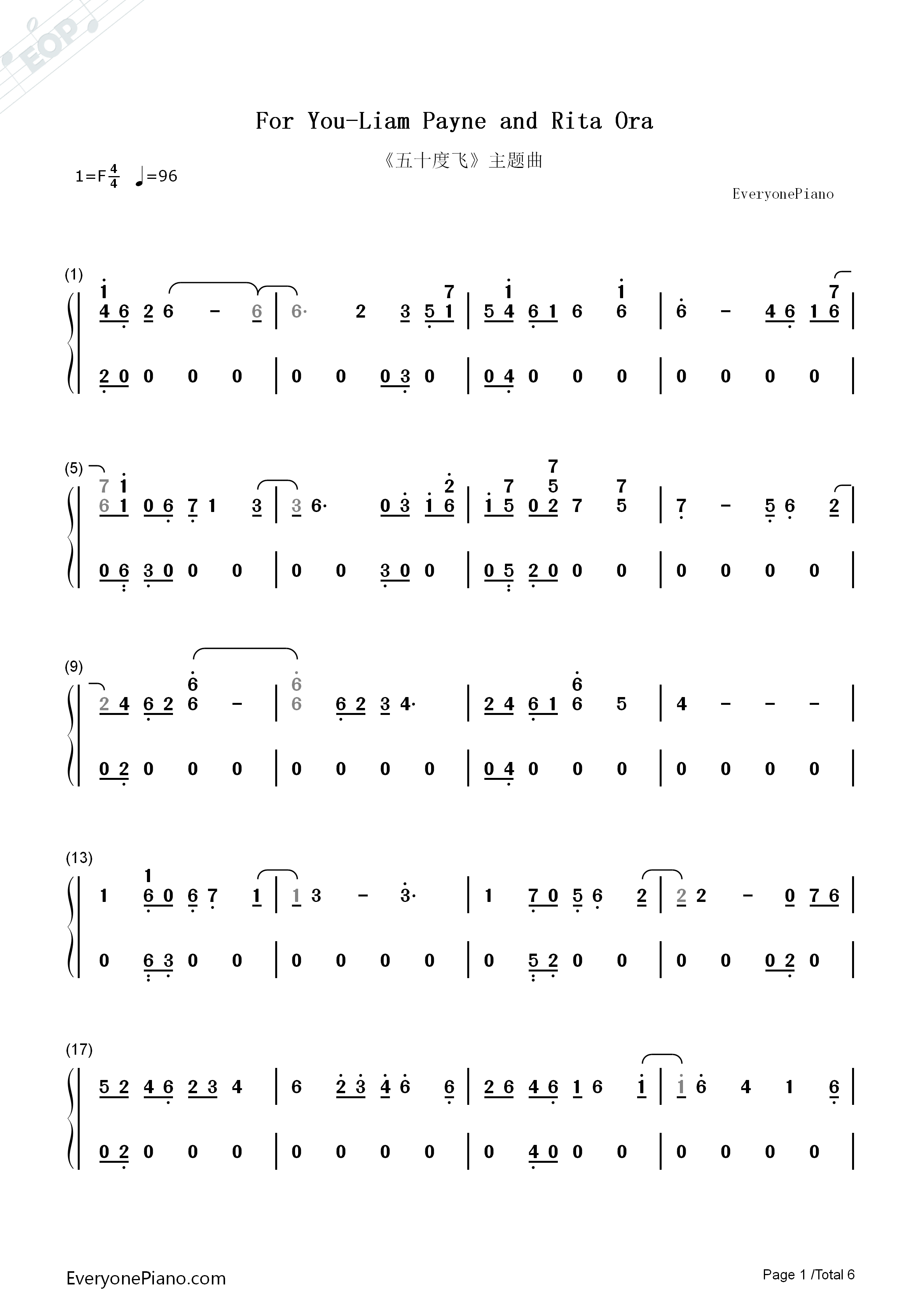 for you-五十度飞主题曲双手简谱预览1
