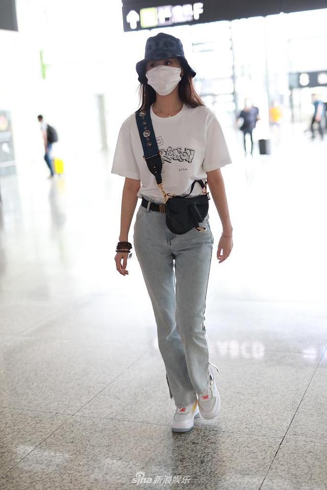 袁冰妍现身机场,白色印花t 水洗牛仔裤,简约时尚