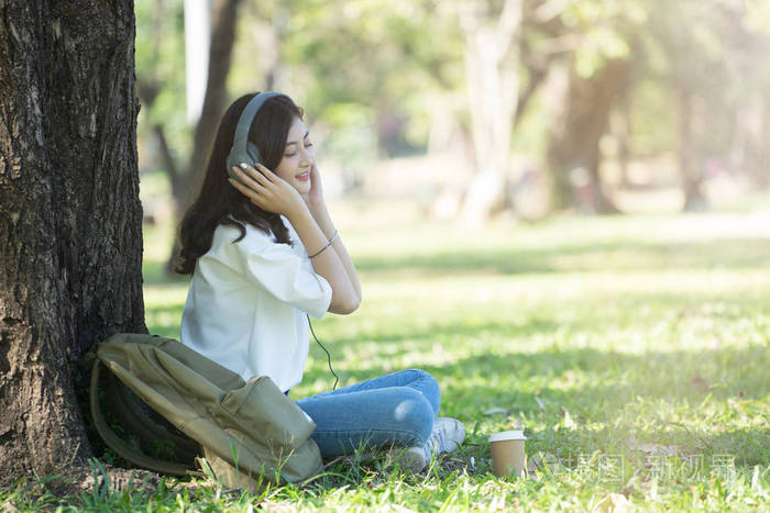 年轻的亚洲休闲时髦女孩听音乐在城市公园