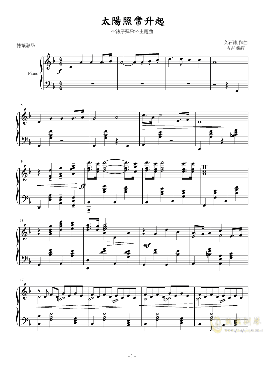 钢琴谱:太阳照常升起(让子弹飞配乐,久石让)