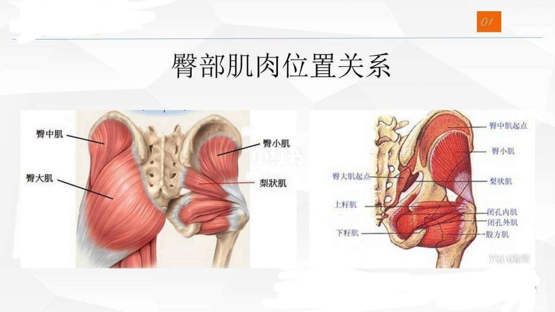 人体位于臀部的肌肉可分为臀大肌和臀中肌,以及隐藏于深层的梨状肌等