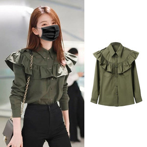 欢乐颂关关同款衣服乔欣同款墨绿长袖荷叶边衬衫长裤套装